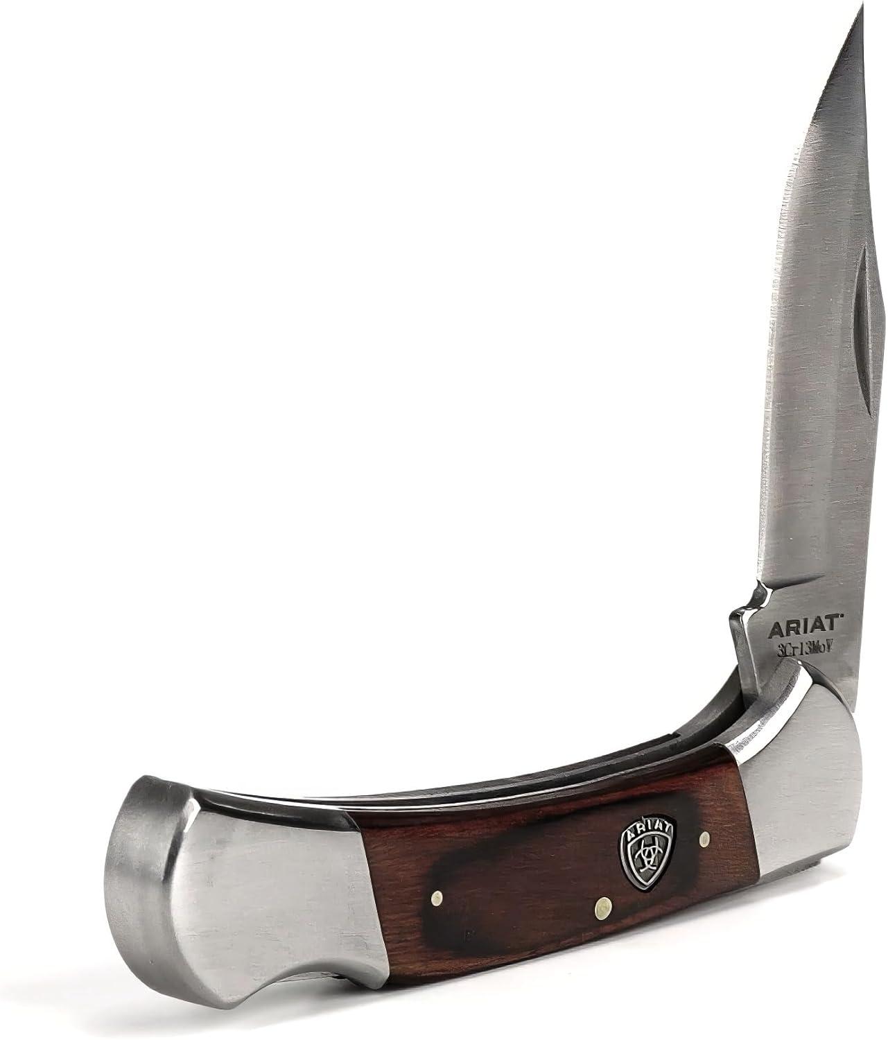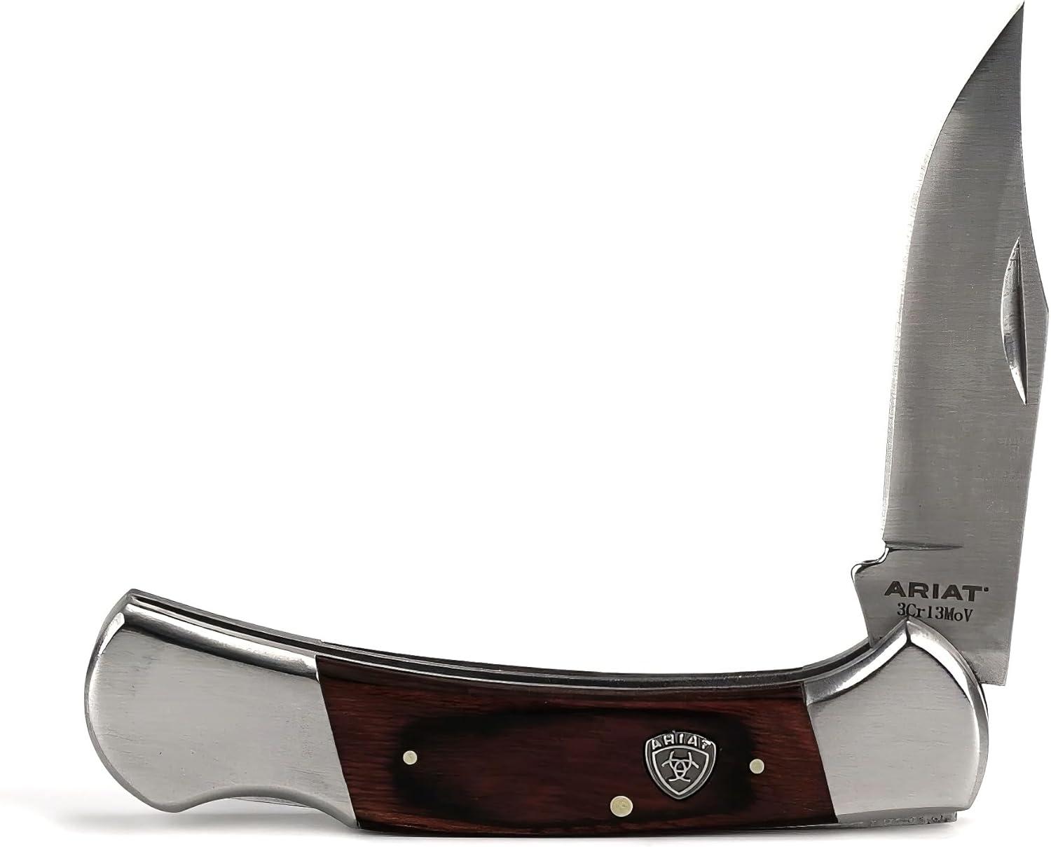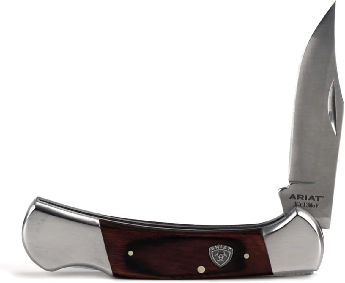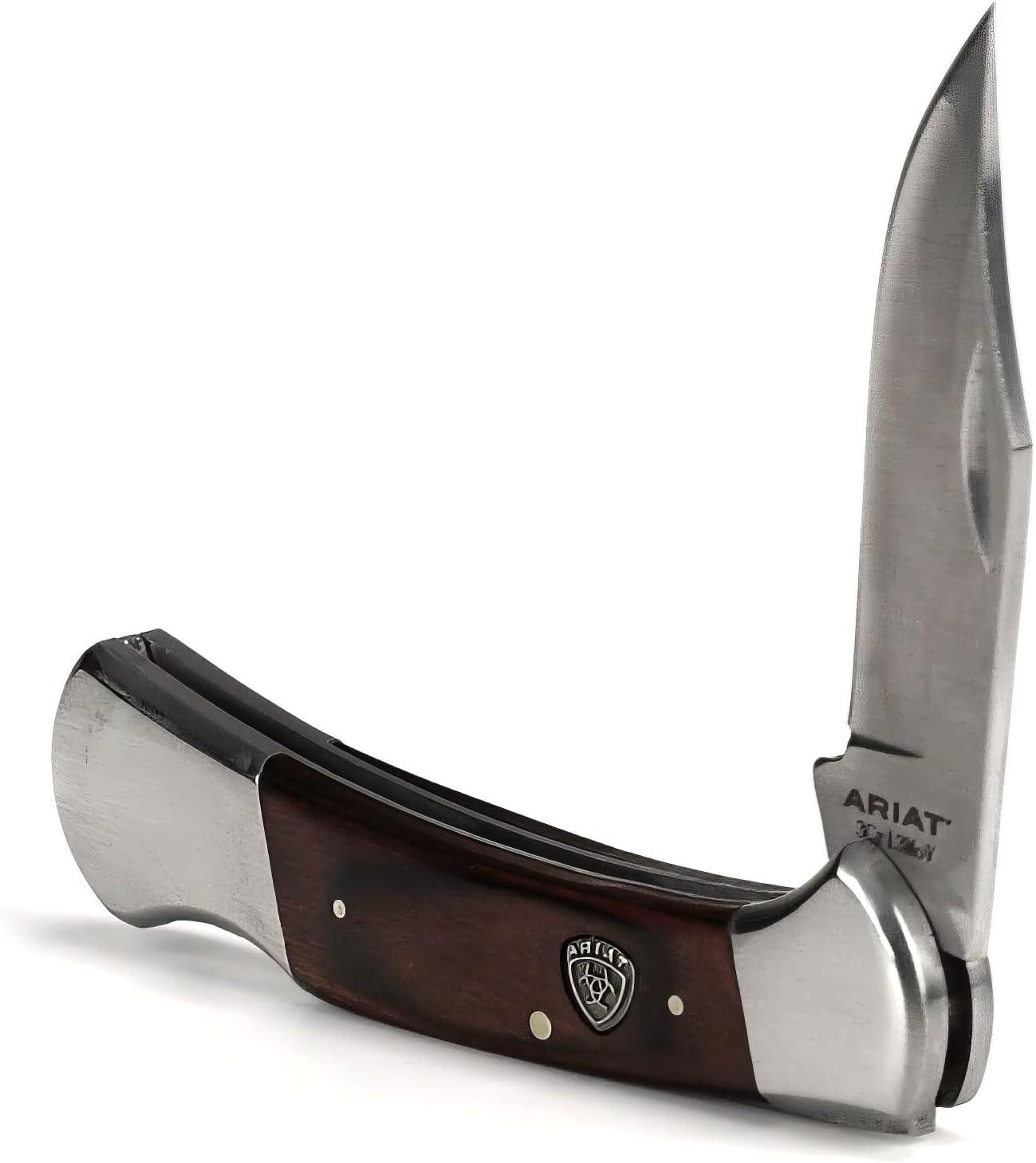 ARIAT Large Folding Knife – 3-3/8″ Smooth 3CR13 Steel Blade with Back Lock and Brown Wood Handle(Brown)
