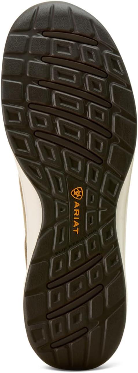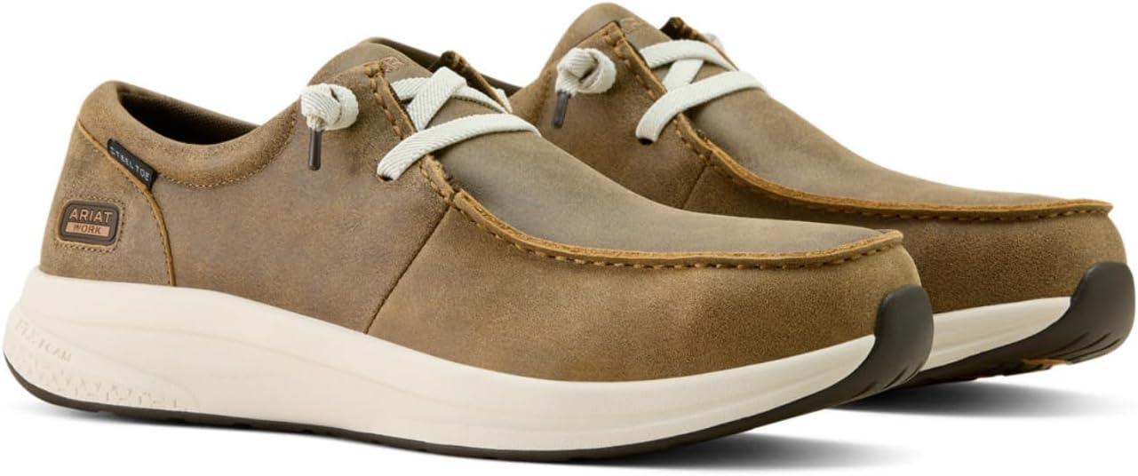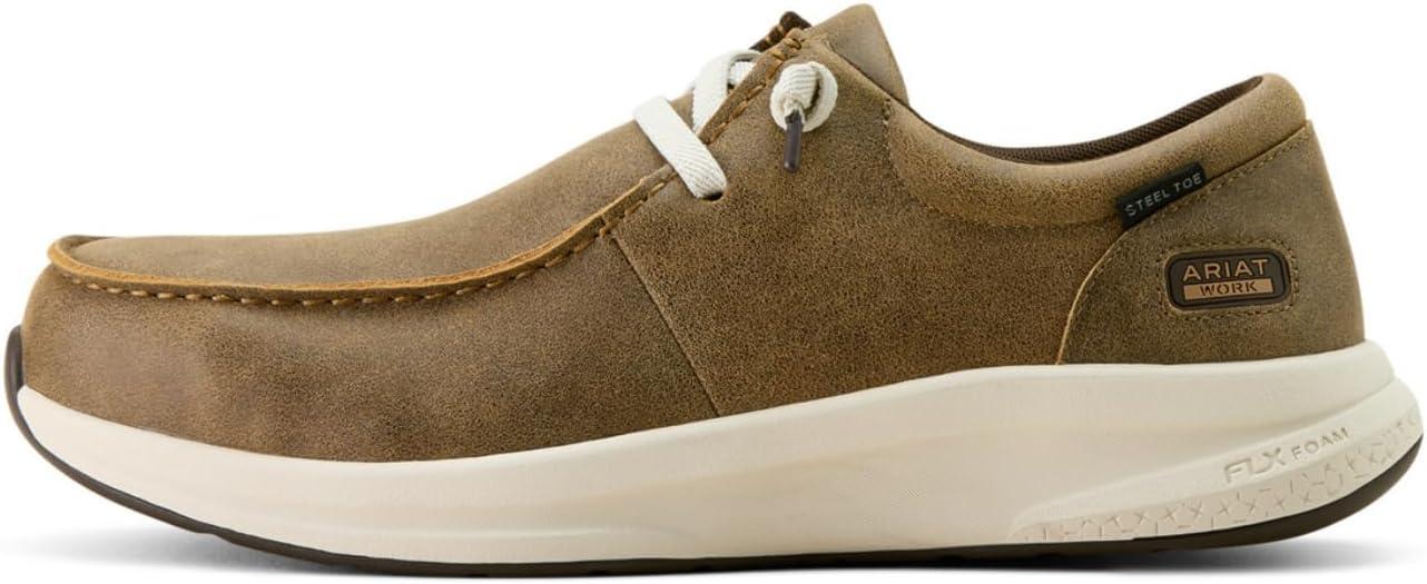 The Ariat Men's Buckeye Steel Toe Work Shoe is the easy comfort of your favorite shoe with the protection of a steel toe. Built for indoor environments, the Ariat Buckeye Safety Shoe has a slip-resistant outsole and long-lasting cushioning for working long shifts on hard floors. The removable All Day Cushioning insole provides maximum comfort during long shifts, while the lightweight FLX Foam midsole has a light springy feel that cushions every step. An oil- and slip-resisting, Duratread sole passes hot contact tests at 300°C/572°F. The flat bottom of these men's work shoes has no defined heel. With full-grain leather, moc toe, mesh lining, and cement construction, these non slip shoes for men are great for all-day wear. Plus, they meet ASTM F2413 standards for safety toe protection and electrical hazard resistance, and ASTM F3445 standards for slip resistance, making them as safe as they are comfortable.