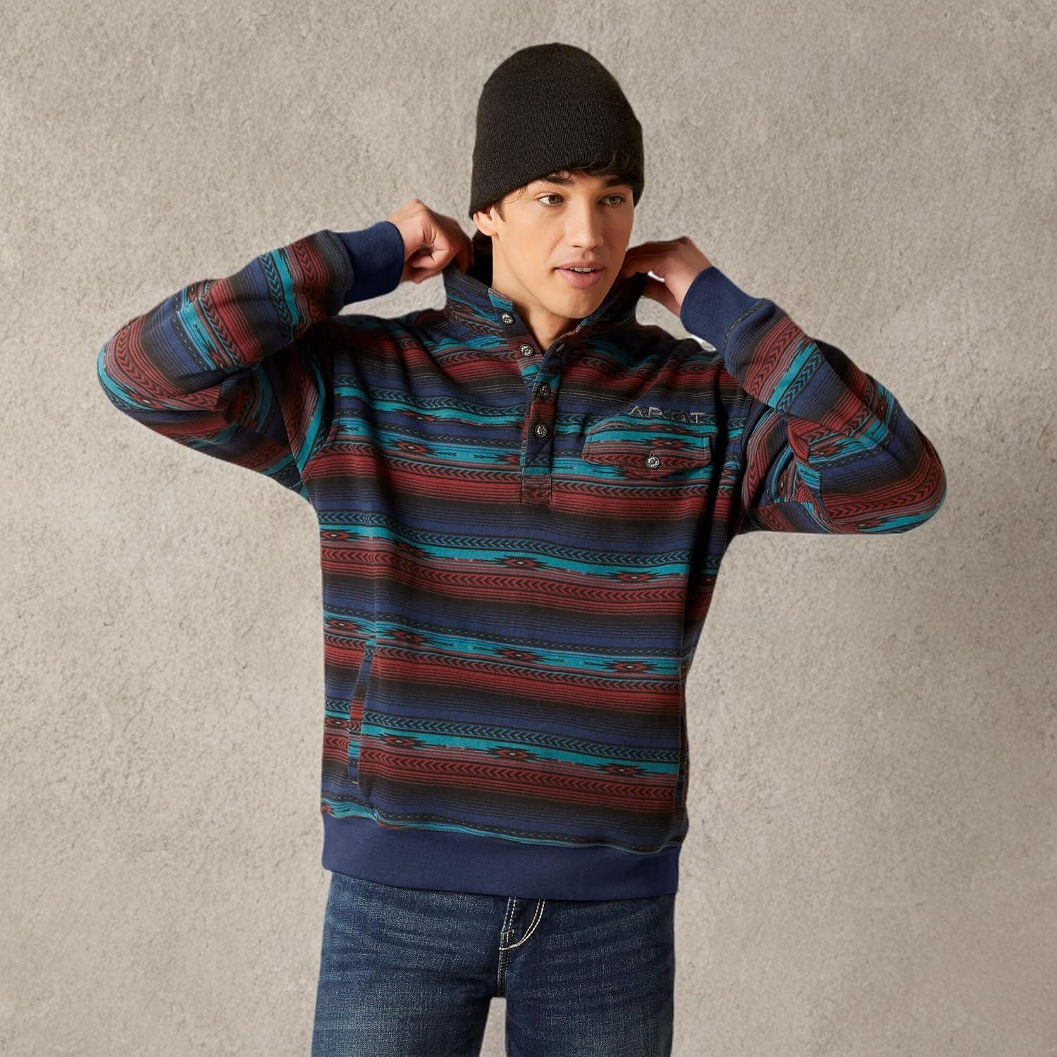 Up your sweatshirt game with this Southwestern pullover. With a mock-neck collar, button placket, and allover print, it looks smart while also being incredibly comfy and cozy.