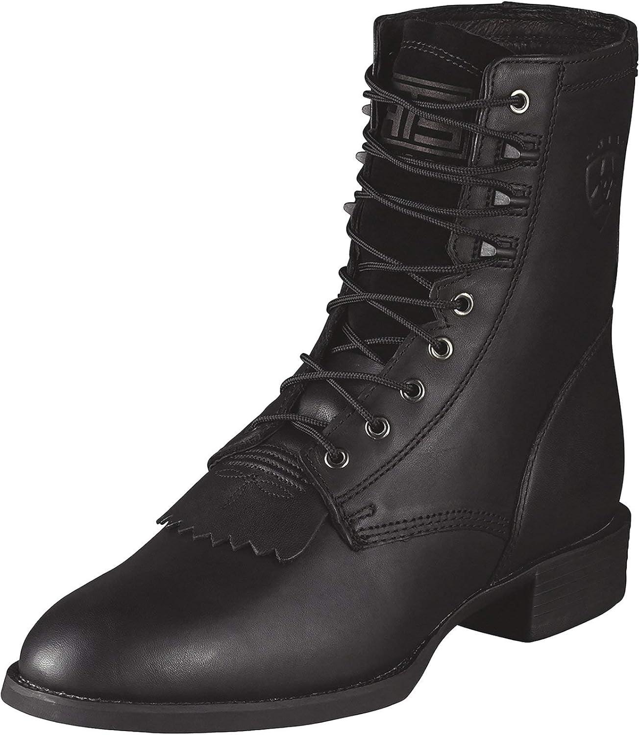 Ariat's Heritage Lacer Western Boot is designed to give superior support and performance. They include Ariat's exclusive ATS, Advanced Torque Stability Technology that supports and cushions the foot as you move, promoting good posture and reducing fatigue so that you can work or play all day long. These leather lace-up boots have; a removable kiltie that not just offers extra protection but also makes a nice traditional statement. With the lace-up option wearing and removing them is easy with an adjustment option. For a better grip and traction on different terrains, there is a Duratread rubber outsole that promotes a lasting performance, protection, and flexibility with a high-resistance to the barnyard acids, oils, and accidental slips, making them an ultimate choice for a day at the barn or a walk around the town. Ergonomically designed, it is the perfect boot choice for the way the classic West works and lives.