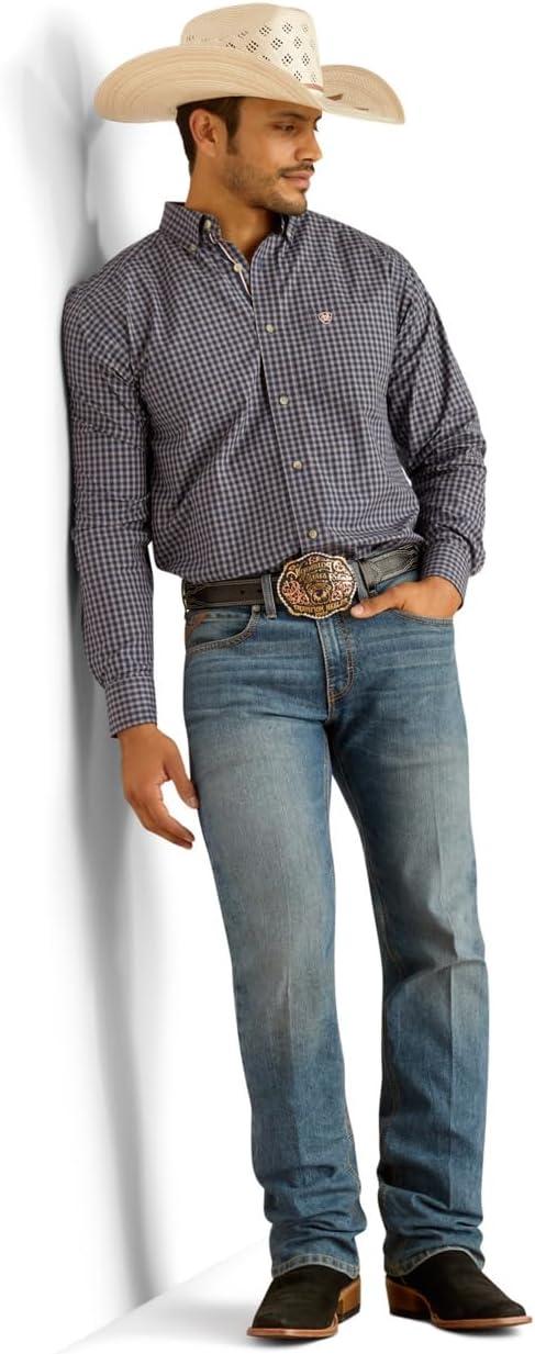 The Ariat Men's M5 Straight Stretch Remming Stackable Straight Leg Jean is ruggedly handsome and supremely comfortable. These jeans are ready for wherever the day or night takes you. The straight leg M5 is fitted through the hip and thigh for a modern yet classic look. Made with the H2Lo finishing process that uses half the water of traditional methods. These Men's jeans feature no-rub comfort inseams with flat construction that prevents abrasion against the skin. Crafted with 12.75 oz ring-spun stretch denim with 73% Cotton, 25% Polyester, and 2% Spandex. These stacked jeans feature an 18.5-inch straight-leg opening for a slimmer fit over boots. Practical details like heavy-duty zippers and hardware, extra deep front pockets, and a Loop Lock that reinforces the back belt loop for extra durability ensure they stand up to tough jobs. These Men's stretch jeans deliver the ideal balance of comfort, durability, and Western style.