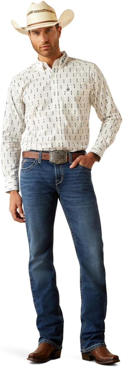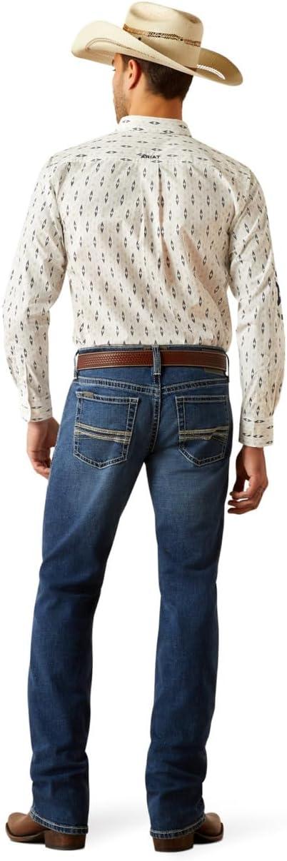 The Ariat Men's M7 Slim Wessley Straight Jean is an update on a classic. Fitted through the hip and thigh with a straight leg, our M7 jeans are slim and modern without being tight or restrictive. These Men's jeans feature no-rub comfort inseams with flat construction that prevents abrasion against the skin. Crafted with 11.25 oz ring-spun stretch denim with 92% Cotton, 4% Elasterell-P, and 4% Spandex. These stacked jeans feature a 17.75-inch straight-leg opening that fits great with boots and casual shoes. Practical details like heavy-duty zippers and hardware, extra deep front pockets, and a Loop Lock that reinforces the back belt loop for extra durability ensure they stand up to tough jobs. These Men's stretch jeans deliver the ideal balance of comfort, durability, and Western style.