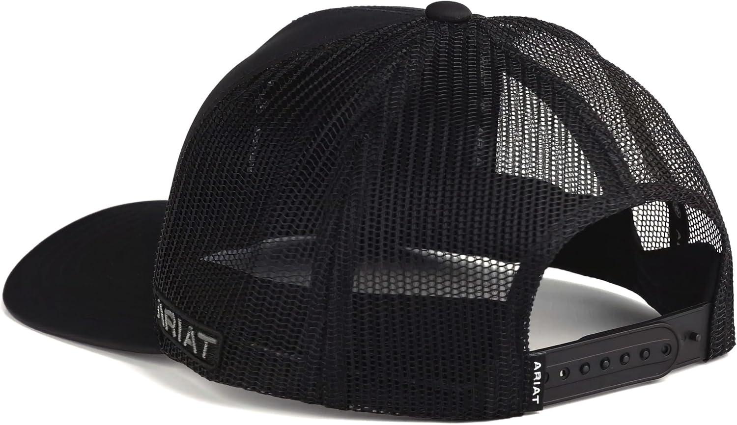 Ariat mens cap by M and F Western Products. Black fabric on the front panels and the bill. There is a metal Ariat shield with a floral engraved background on the front. Black mesh back and snap back closure for that perfect fit.Ariat Mens CapBlack6 Panel, StructuredBlack StitchingMetal Ariat ShieldSnap Back Closure99% Polyester, 1% Spandex