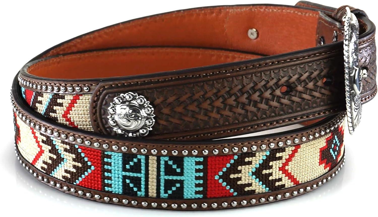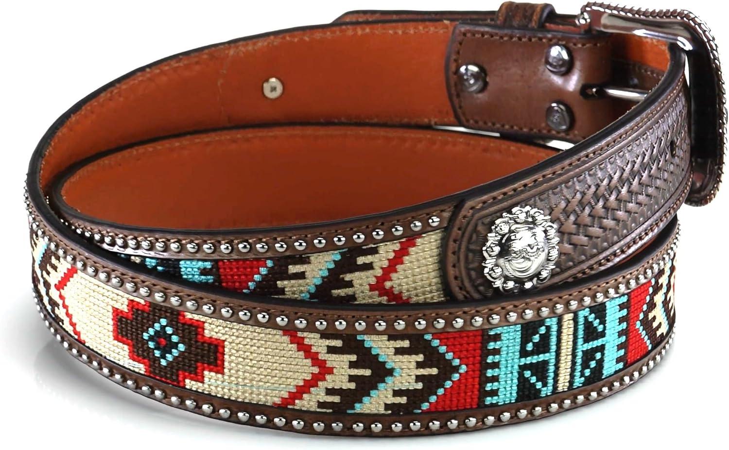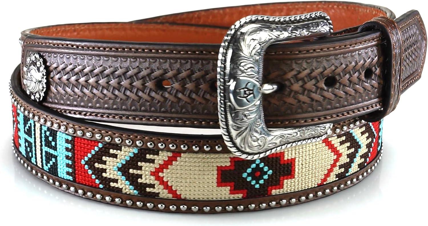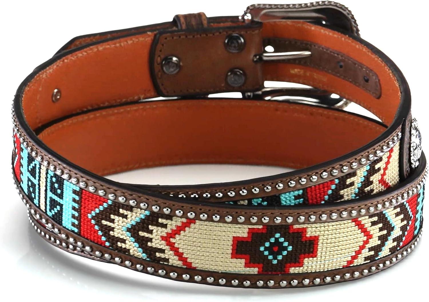 Mens Ariat Belt: Mens Ariat Western Accessory. This Ariat men’s belt by M&F Western Products is genuine leather and has a stunning blue and turquoise southwestern pattern embroidered on the 1 1/2″ strap. Removable buckle. A1038702