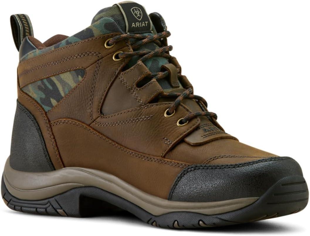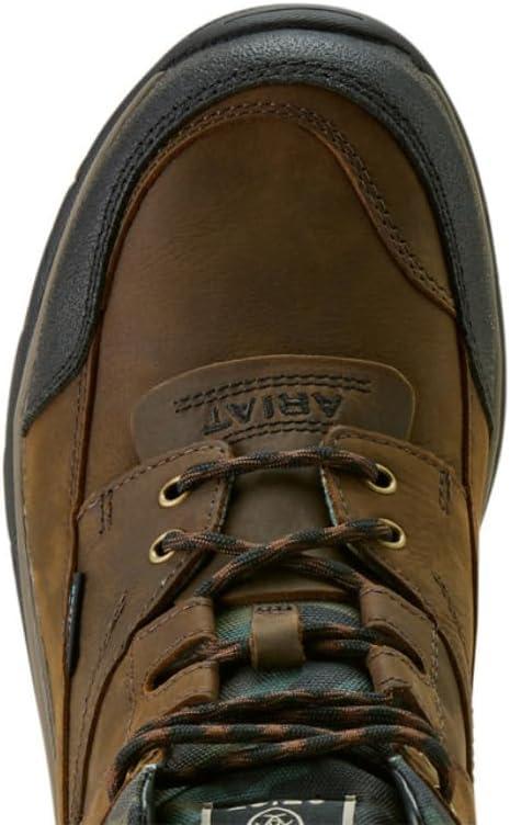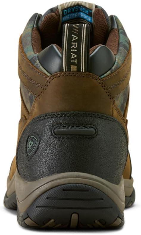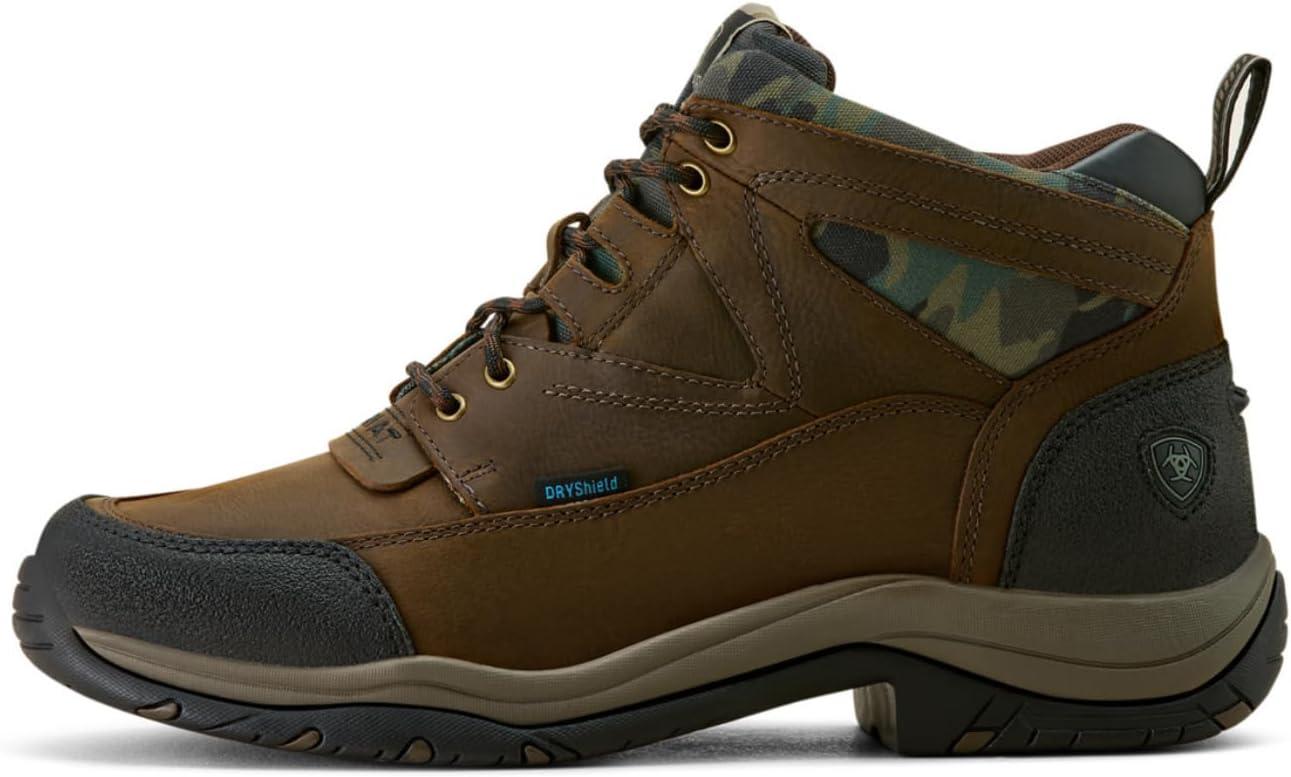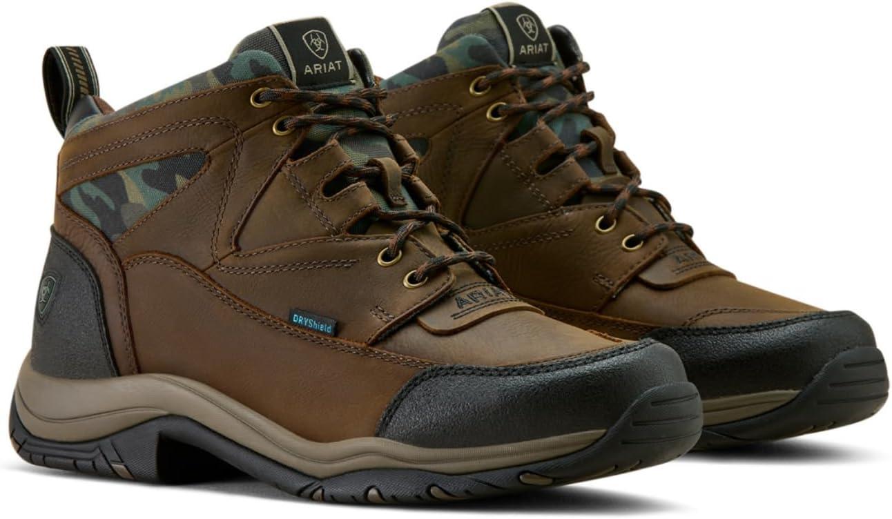 The Ariat Men’s Terrain Waterproof Boot is great for endurance riding to cover a lot of ground, a variety of terrain, and shifting weather. This work boot for men is ready to meet any challenge with all-day comfort and durability built right in. The DRYShield waterproof-breathable construction with full-grain leathers and an impermeable barrier delivers trusted durability and dry feet. Engineered for lasting comfort and durability, it features ATS technology that provides ergonomic support on uneven terrain and an EVA midsole for shock absorption. Designed with a stirrup-friendly Duratread sole that is extremely durable while still letting your foot flex and an All Day Cushioning insole. The men’s ankle boots are crafted from a waterproof, full-grain leather upper, breathable lining, and padded collar at topline that combines rugged style with stability. The 5” upper, 2” heel height, and round toe create a functional fit for work and everyday wear. Conquer your day with the unmatched comfort and rugged durability of these men’s hiking boots.