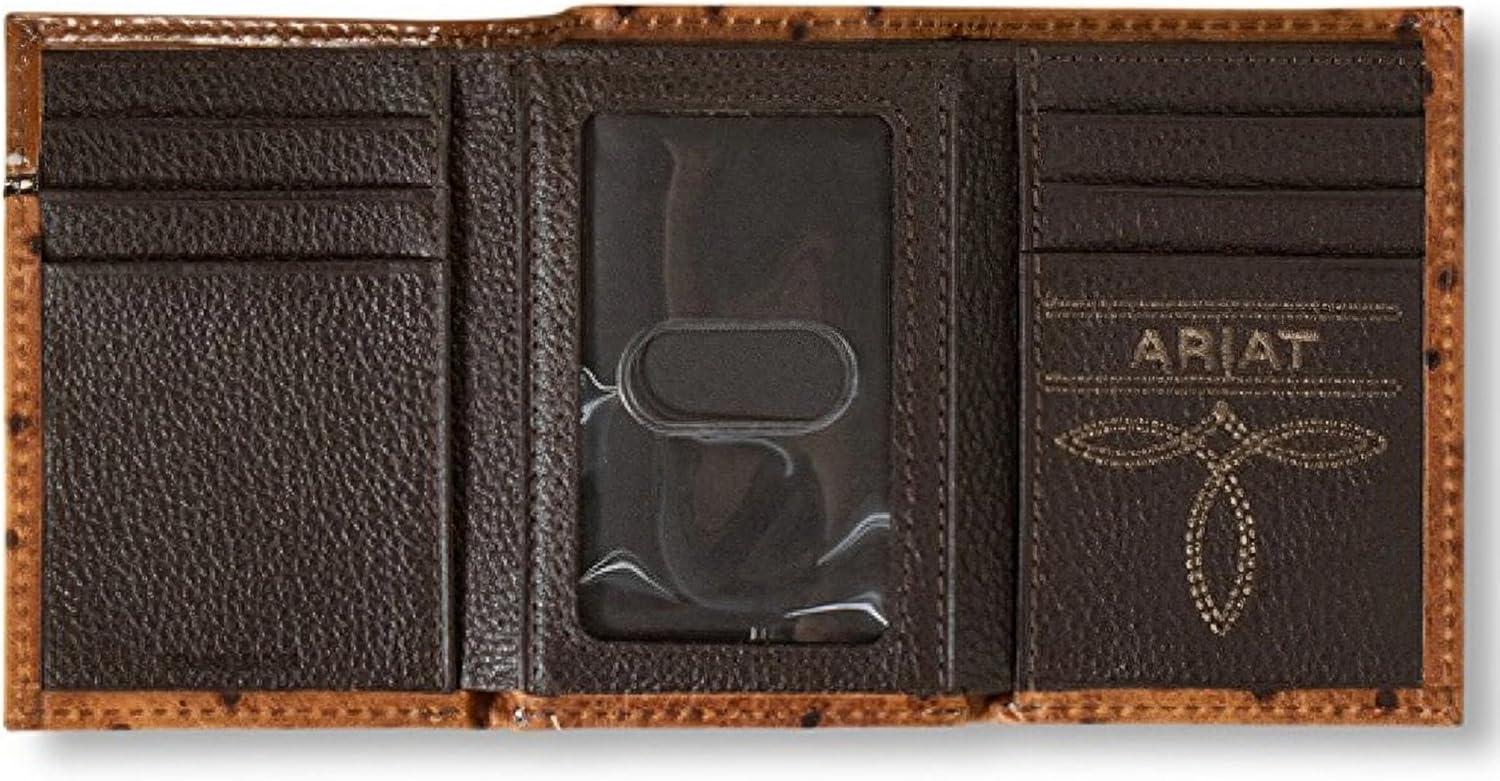 Mens Ariat Wallet: Ariat men's trifold wallet by M&F Western Products. This great wallet is made of genuine leather with an ostrich pattern and heavy duty stitching. Accented with a tan tab with floral embossing. Slim fit design. Credit card slots and one clear ID pocket for plenty of storage. A3553202