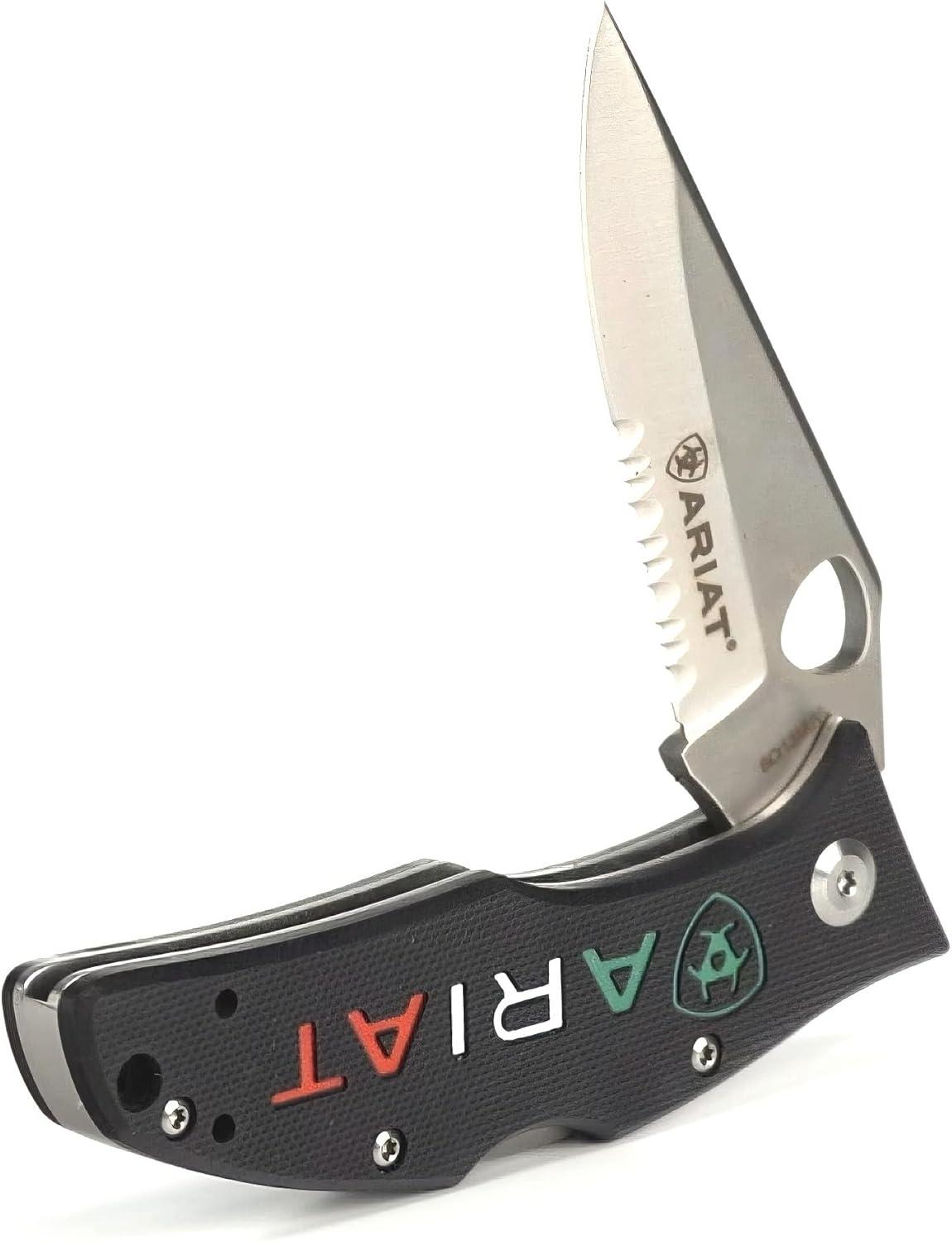 G10 Black Handle: Lightweight, rugged composite with textured grip and Mexico-inspired Ariat logo detail in red, white, and green.