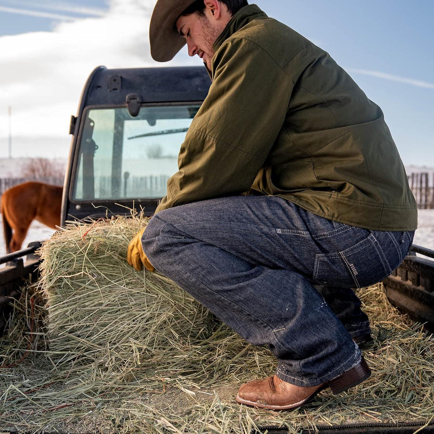 Rebar Jeans are built to last. With twice the durability thanks to the ToughMax denim and Durastretch for maximum flexibility, these jeans are low rise and relaxed through the waist, hip and thigh. The stackable, boot-cut design allows you to easily slip these men's work jeans over your boots and the medium wash with sanding and tacking looks worn, but sophisticated. Perfect for work on a construction site or on the farm, you won't be disappointed with the men's Rebar M4 Low Rise jeans with Durastretch.