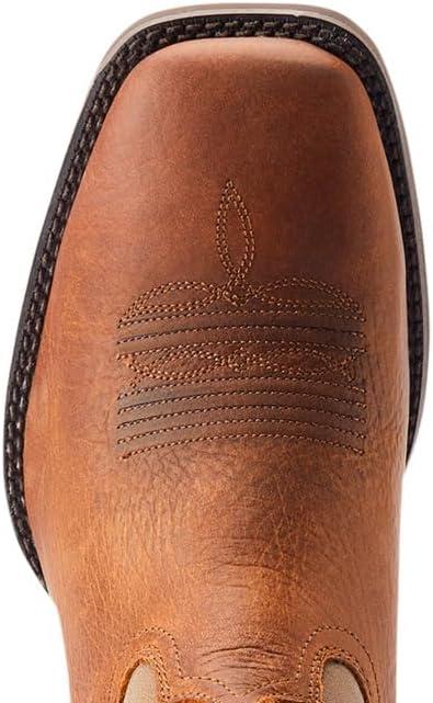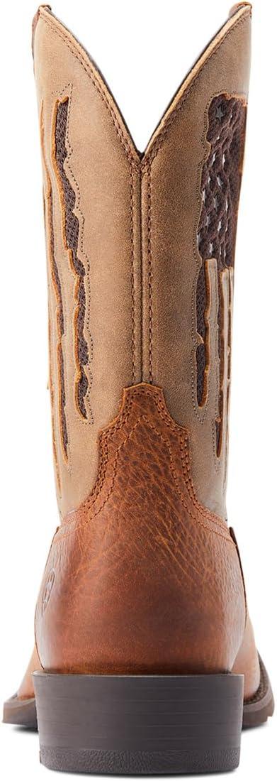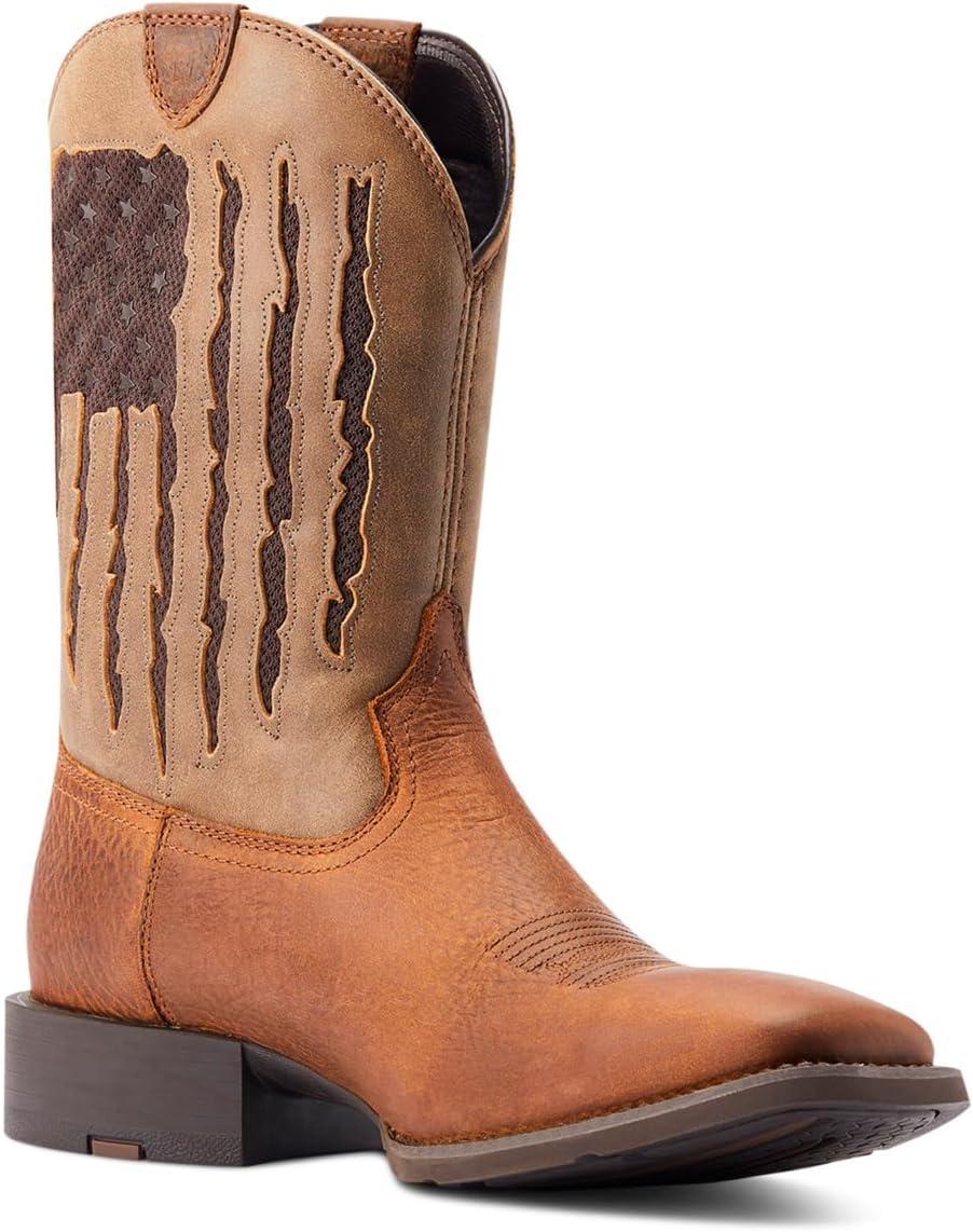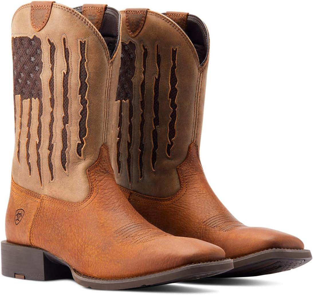 The Ariat Men’s Sport My Country VentTEK Western Boot helps you sport your patriotism with mesh VentTEK panels that add style and function, boosting airflow to keep you cool on the farm or at a festival. Engineered for lasting comfort and strength, a Duratread sole that is extremely durable while still letting your foot flex and a removable All Day Cushioning insole. Built with ATS technology that provides ergonomic support on uneven terrain. The men’s cowboy boots are crafted from full grain leather and double stitch welt that combine rugged style with reliability. The 11” shaft height, 1.5” roper heel height, and wide square toe create a functional fit for work and everyday wear. The shaft features a vertical flag with star embellishments to show off your patriot pride. Conquer your day with the unmatched comfort and rugged durability of these square-toe boots for men.
