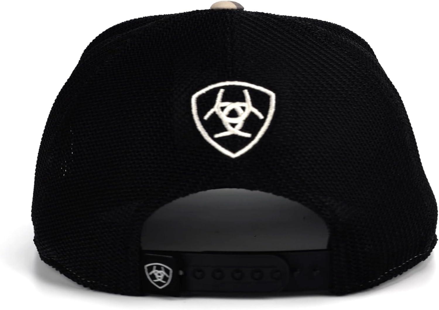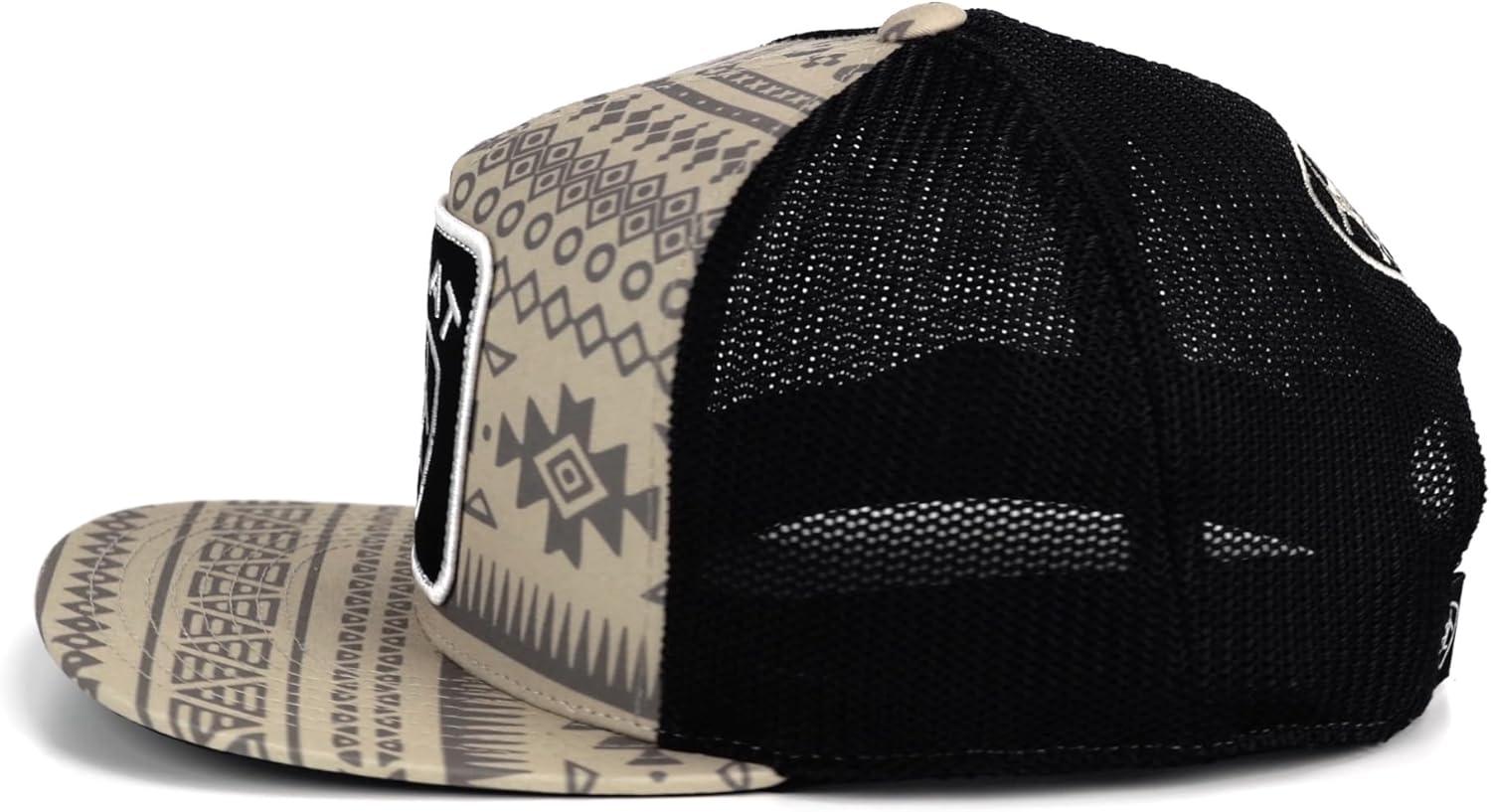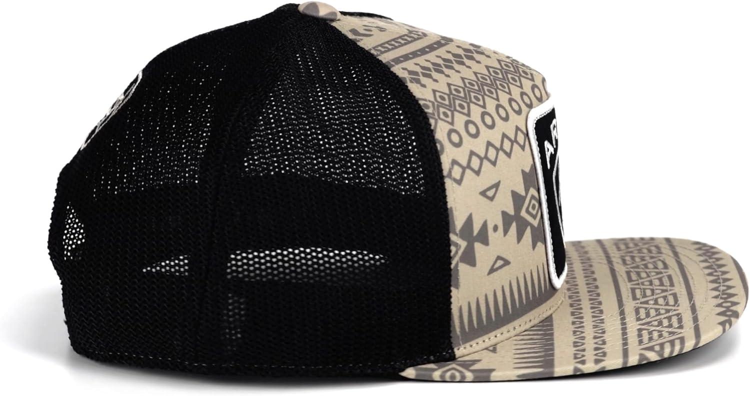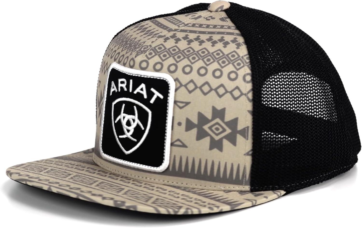 Elevate your cap collection with the ARIAT Men's Flexfit 110 Cap, a fusion of heritage and modern style. This cap features a distinctive tan Aztec patterned fabric that sets a unique backdrop for the bold black patch adorned with the white embroidered Ariat name and logo, making a strong statement of identity and style.