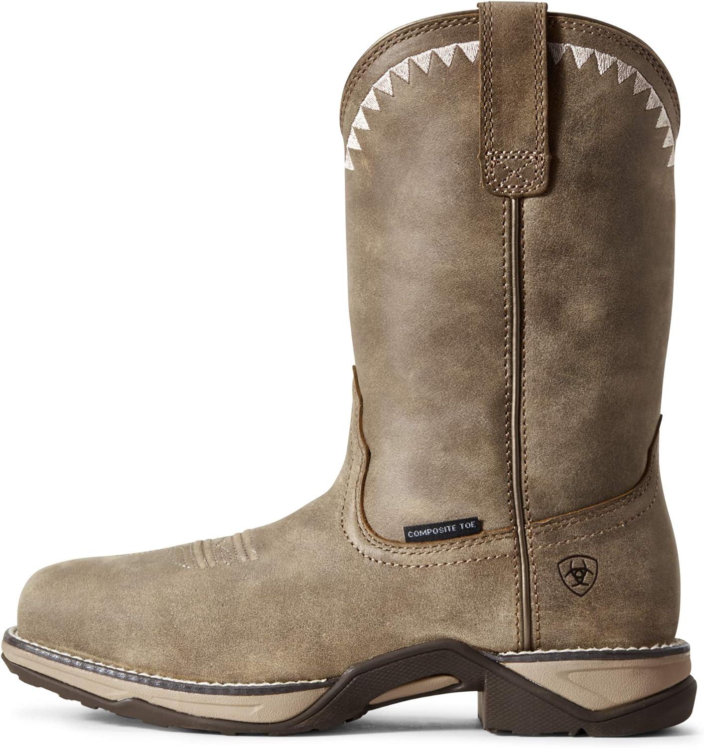 The Ariat Women’s Anthem Deco Composite Toe Work Boot is built for a woman’s foot. Anthem will keep your feet happy for as long as you’re on them. With flexible support and lightweight, incredibly comfortable cushioning, it’s the ultimate all-day, any job work boot. Ideal for farm and ranch work and construction. Designed with 4LR technology to provide lightweight support and stability no matter the conditions. The oil- and slip-resisting Duratread sole provides maximum wear resistance and passes hot contact tests at 300°C/572°F. Receive the comfort you need with the removable All Day Cushioning insole and lightweight EVA midsole that absorbs shock. This working boot for women delivers decorative embroidered stitching on the collar with full-grain leather on a 10-inch shaft. They deliver long-lasting durability while meeting ASTM F2413 and ASTM F3445 standards for electrical hazard resistance on a composite toe design and slip resistance. They are also non-metallic for added safety and are metal-detector friendly.