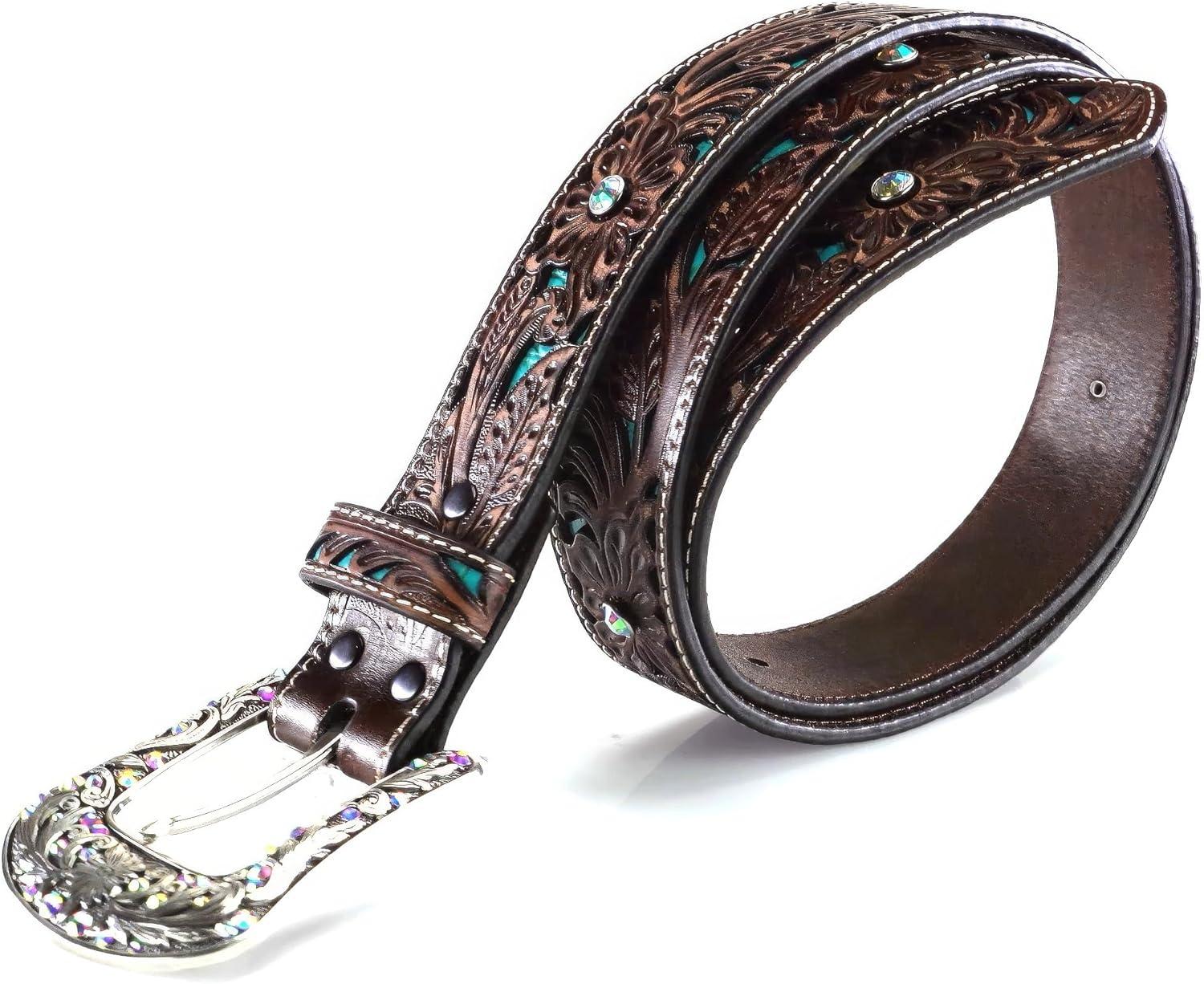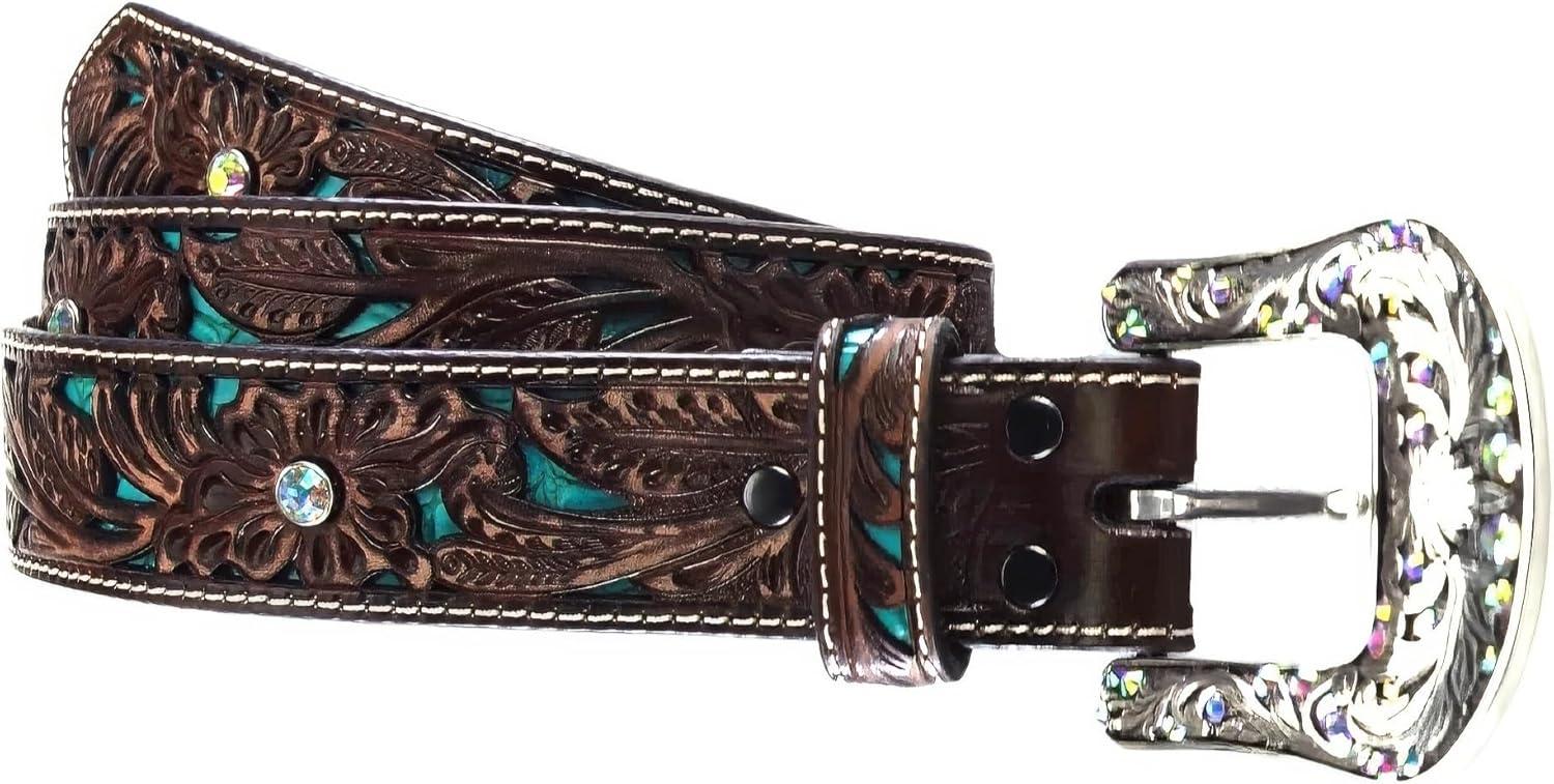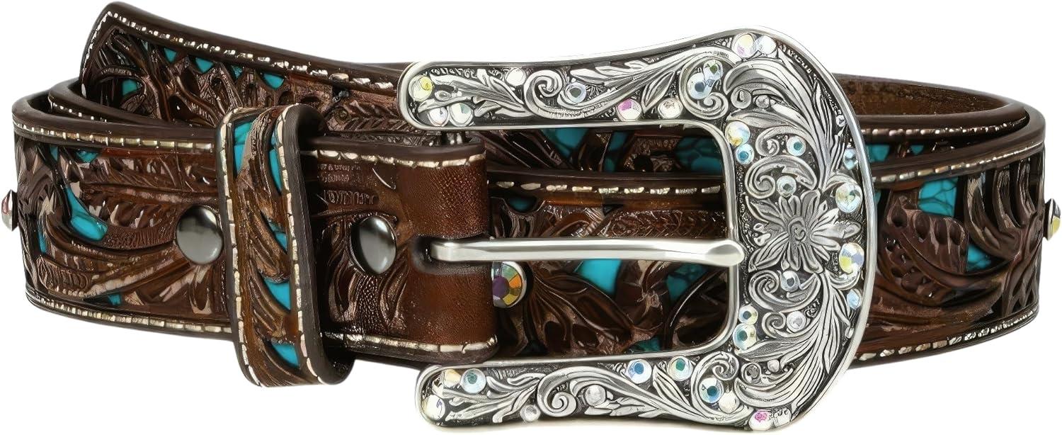 This ladies Ariat belt by medium and f western products is definitely fashion forward.  brown strap has a beautiful turquoise inlay pattern with rhinestones for just the right amount of sparkle.  The removable buckle makes it customizable for your favorite buckle.  Perfect belt for any pair of jeans.