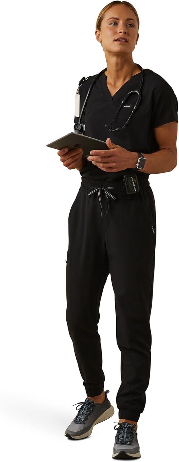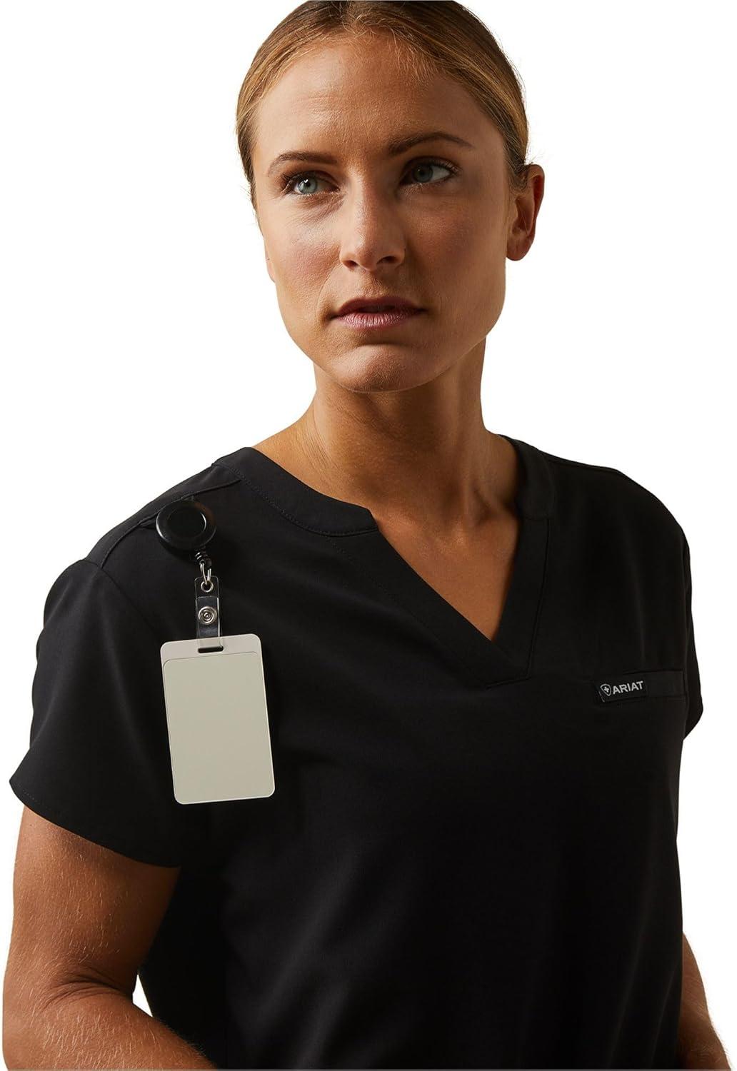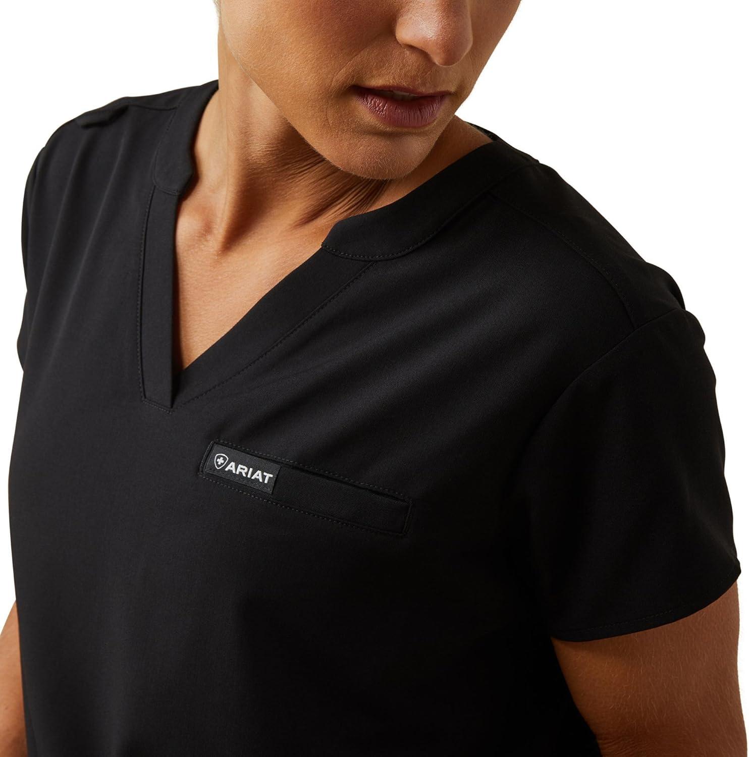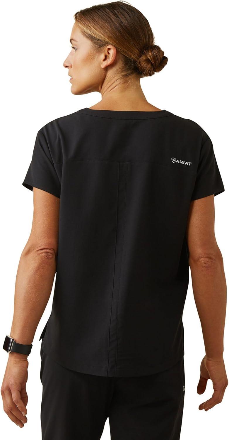 The Ariat Women’s Eliza Scrub Top offers a stylish twist on traditional scrubs with its distinctive collar and cap sleeves. Crafted from Nua recycled stretch fabric, these scrubs for women provide a contoured fit with enough room for all-day comfort. Designed to keep you cool and fresh, it features ClimateTEK for dynamic and temperature-regulated cooling and Moisture Movement Technology to keep you dry. Silver-based FreshTEK+ ensures sustainable odor resistance, while stain-repellent fabric and breathable perforated panels at the back and underarms add to its functionality. Thoughtful details like Greater Arm Mobility for freedom of movement, a convenient badge holder, a locker loop, and a chest pocket make this nursing scrub top as practical as it is stylish. Plus, it's made from materials that meet bluesign sustainability standards, offering a responsible choice for your workday.