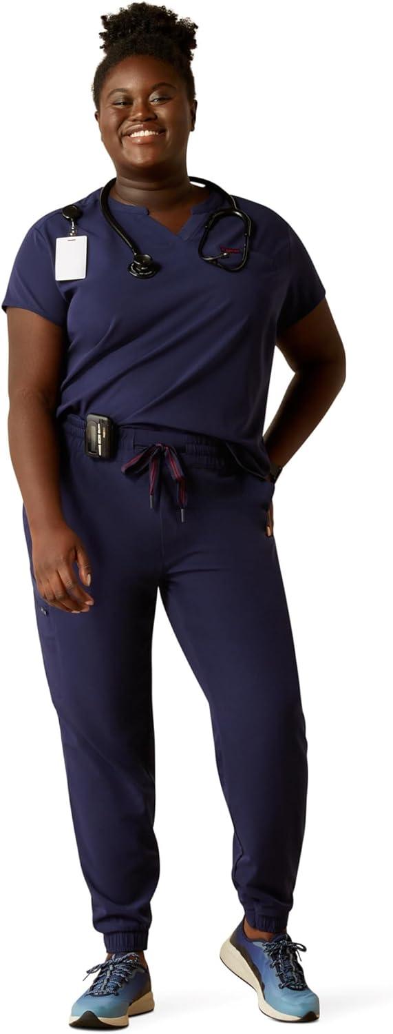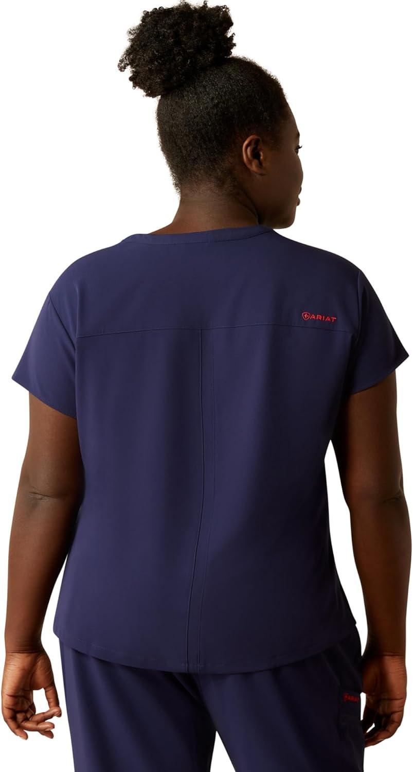 The Ariat Women’s Eliza Scrub Top offers a stylish twist on traditional scrubs with its distinctive collar and cap sleeves. Crafted from Nua recycled stretch fabric, these scrubs for women provide a contoured fit with enough room for all-day comfort. Designed to keep you cool and fresh, it features ClimateTEK for dynamic and temperature-regulated cooling and Moisture Movement Technology to keep you dry. Silver-based FreshTEK+ ensures sustainable odor resistance, while stain-repellent fabric and breathable perforated panels at the back and underarms add to its functionality. Thoughtful details like Greater Arm Mobility for freedom of movement, a convenient badge holder, a locker loop, and a chest pocket make this nursing scrub top as practical as it is stylish. Plus, it's made from materials that meet bluesign sustainability standards, offering a responsible choice for your workday.
