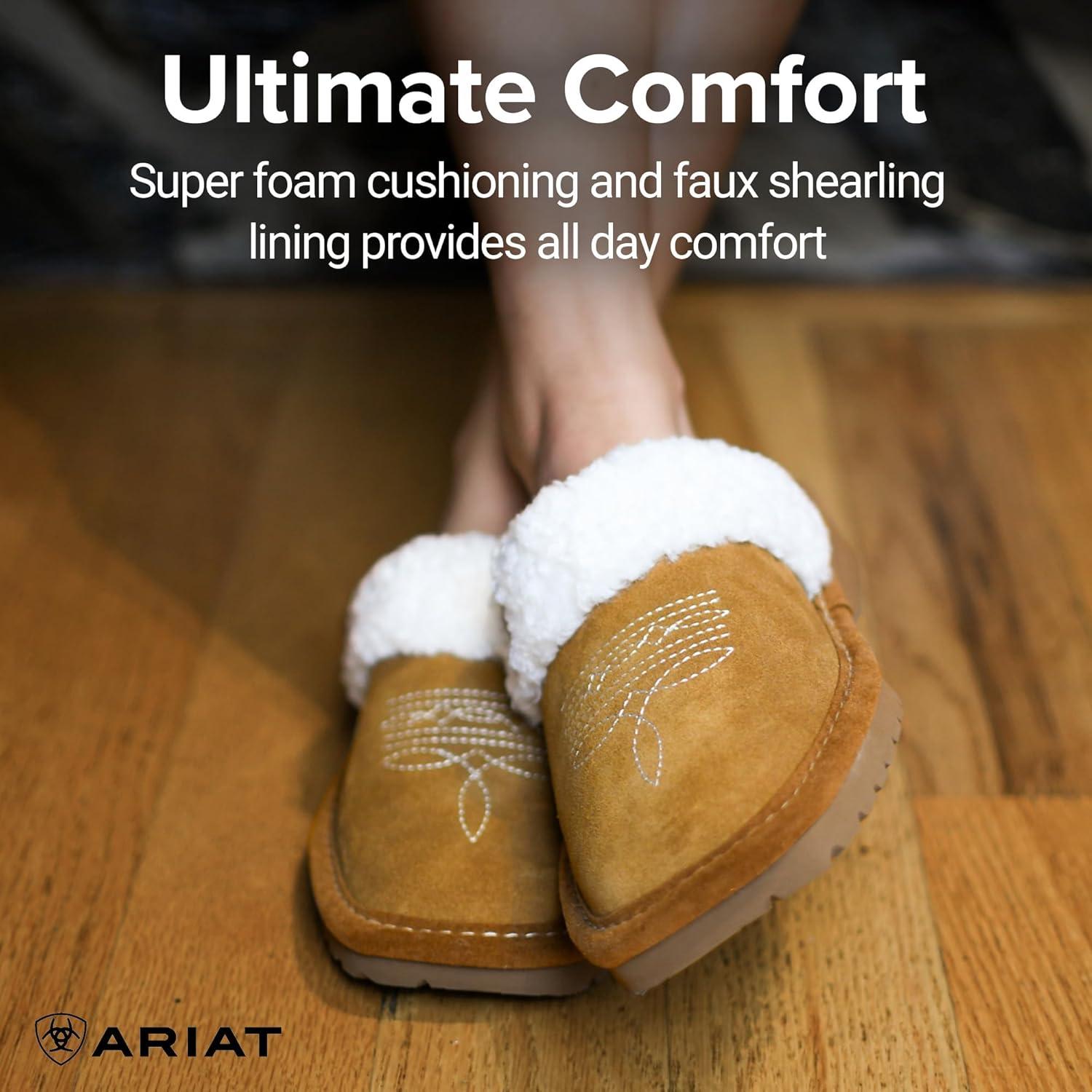 ARIAT WOMEN'S INDOOR & OUTDOOR WARM GENUINE SUEDE LEATHER RUBBER BOTTOM JACKIE SQUARE TOE SLIPPERS WITH PLUSH COLLAR