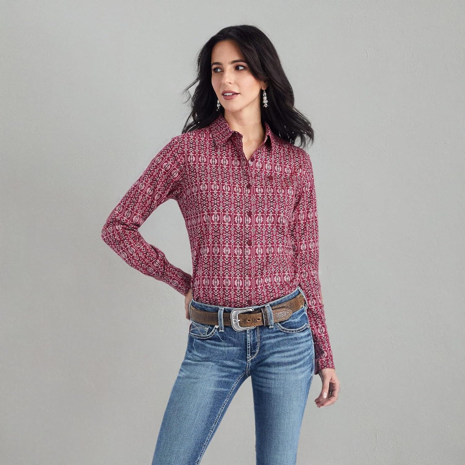 Say hello to spring with a shout of color. The kirby shirt is made from solid poplin, with a single chest pocket and a button down closure. Ariat's greater arm mobility technology provides an ideal fit and comfort when in motion.
