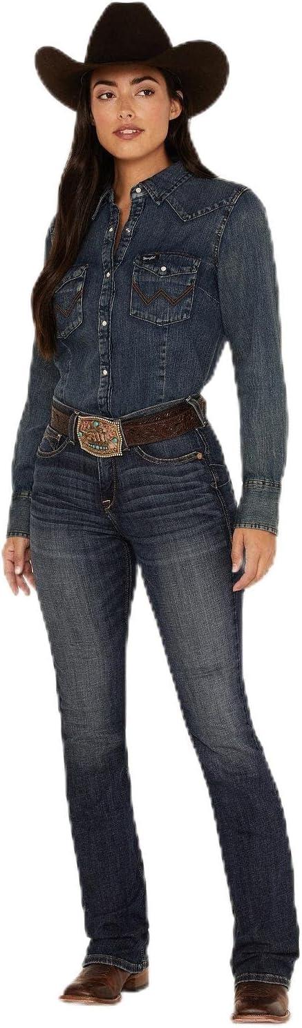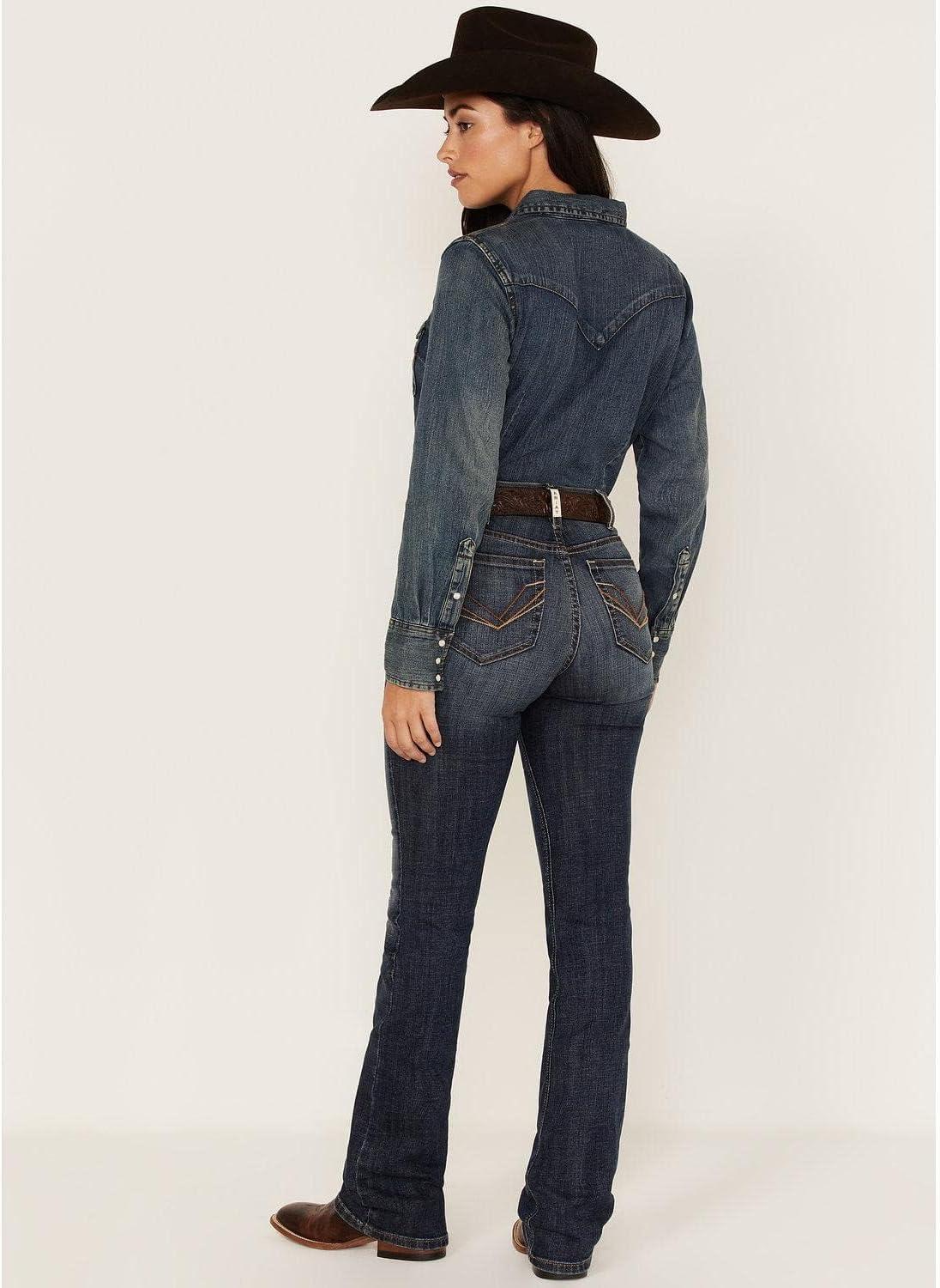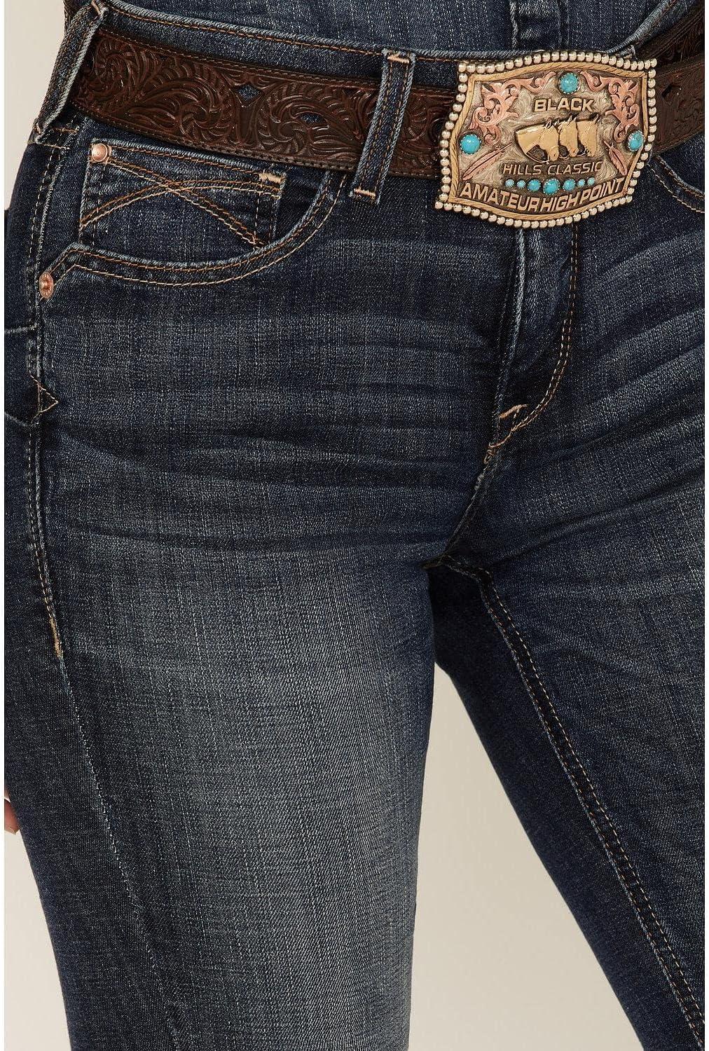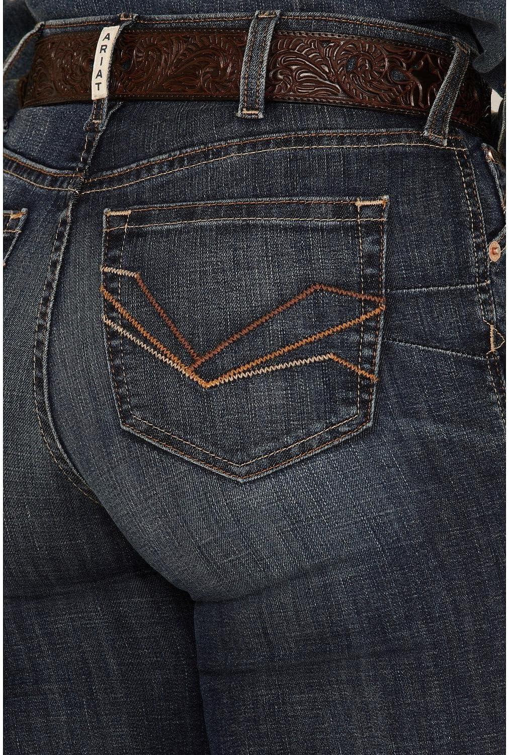 The Ariat Women’s High-Rise Fernanda Boot Cut Jean is a high-rise version of our best-selling bootcut. This waist accentuating jean comes in a wear with everything dark wash and feature a cool ombre back pocket. The slim fit through the hip and thigh, the 10-inch high-rise that sits at the small of the waist, and the 18.75-inch boot cut leg stacks perfectly over boots. Built with a contoured waistband that hugs your curves for a fit that moves with you. Materials include stretch denim with 95% Cotton, 4% Estrerell-P, 1% Lycra Spandex. Inseam measurements include short at 31”, regular at 33”, long at 35”, and extra-long at 37”.